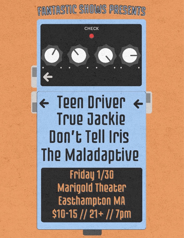 Home / Theater Tickets / Teen Driver, True Jackie, Don’t Tell Iris, The Maladaptive Teen Driver, True Jackie, Don’t Tell Iris, The MaladaptiveIn stock Pay what you like ( $ ) Teen Driver, True Jackie, Don't Tell Iris, The Maladaptive quantity Purchase Tickets SKU: 1f6193f1 Category: Theater Tickets Related products Peter Mulvey | Bring It To Bear Choose price SALSA SUNDAYS: Latin Dance Party Choose price Easthampton Public Library Karaoke Choose price Circus Trees | Match | Deerest Choose price
